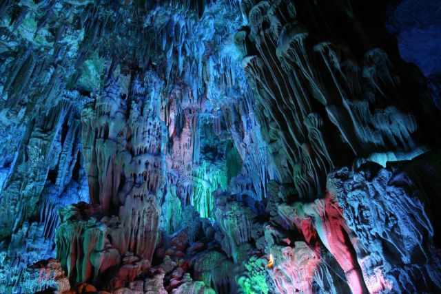 Inside the Reed Flute Cave is a spectacular world of different stalactites and rock formations shimmering with amazing colors of artificial lighting. It all creates an impressive effect!